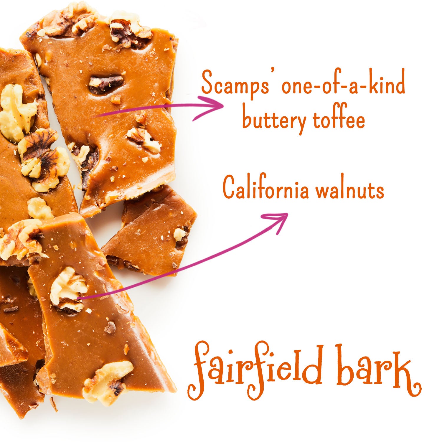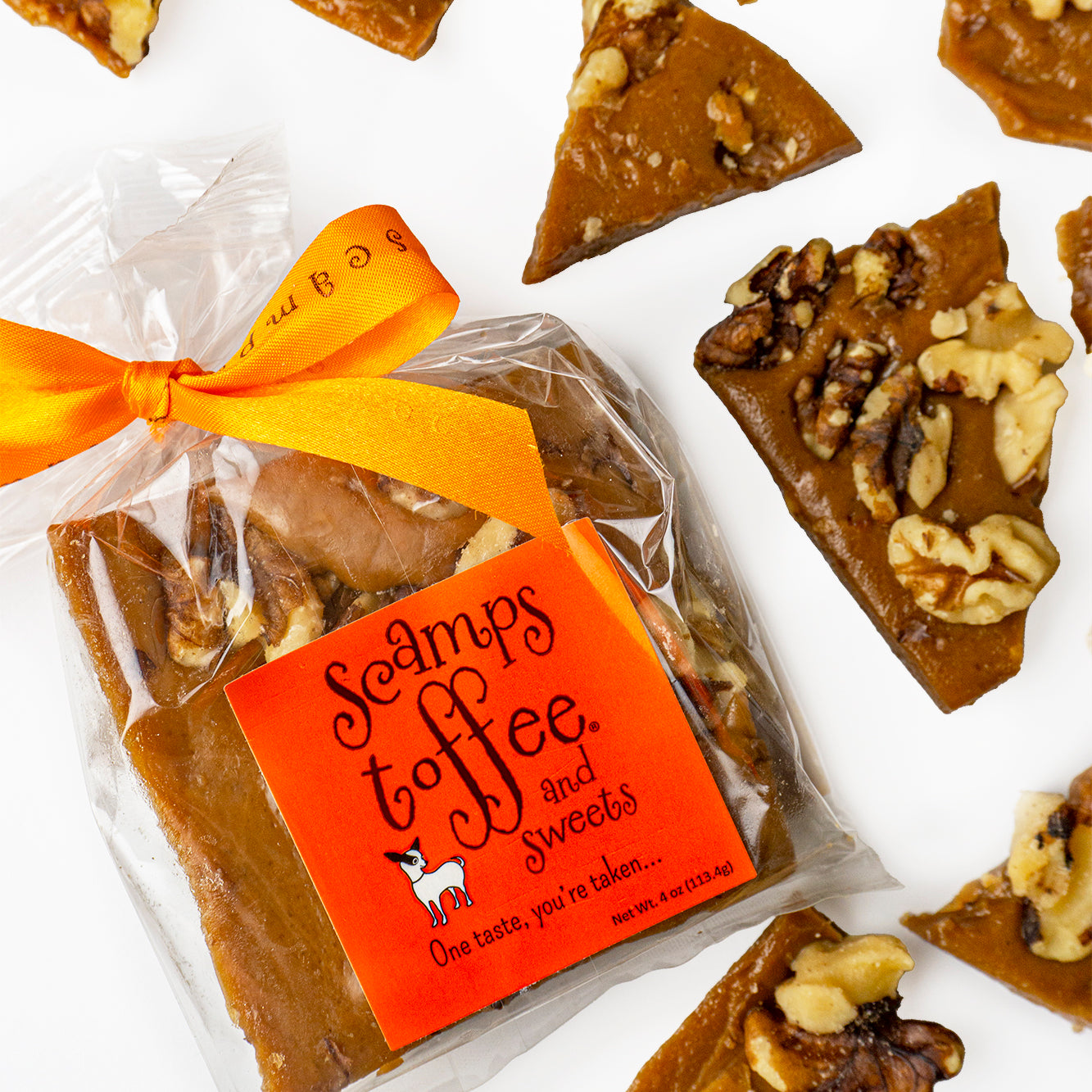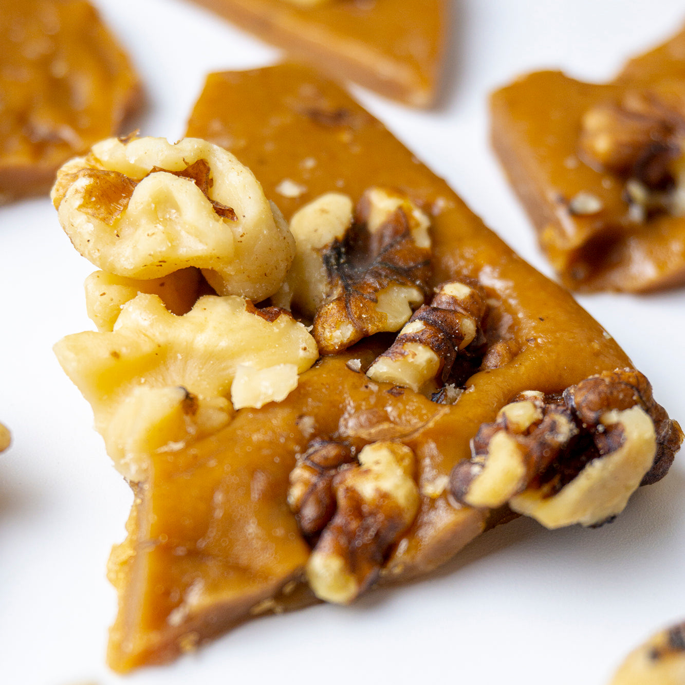 Our buttery toffee poured over whole walnuts. Pure toffee decadence. All natural, gluten-friendly and preservative free.