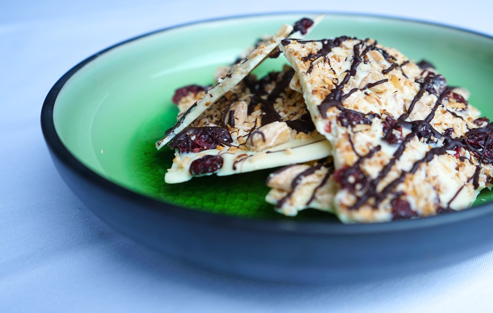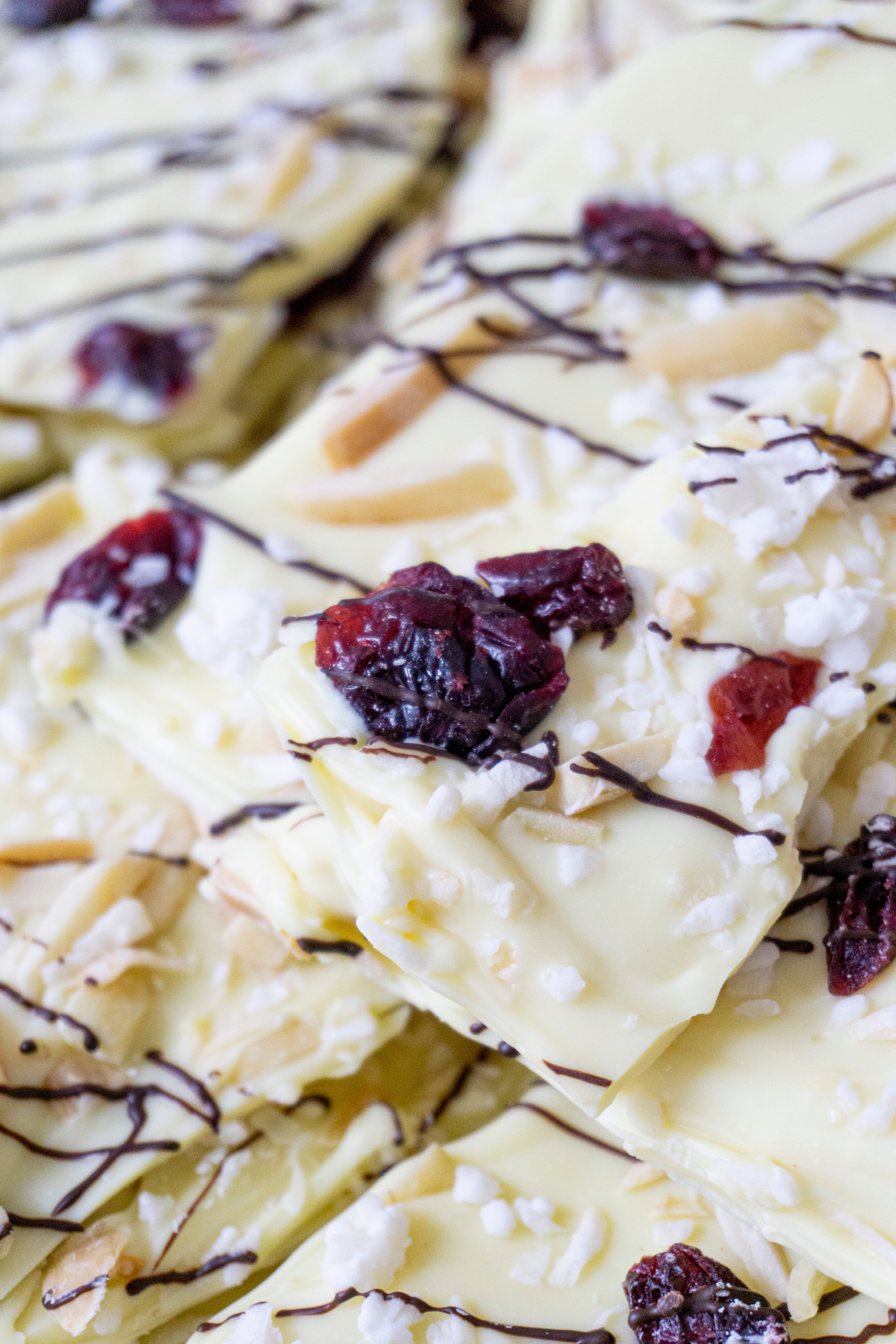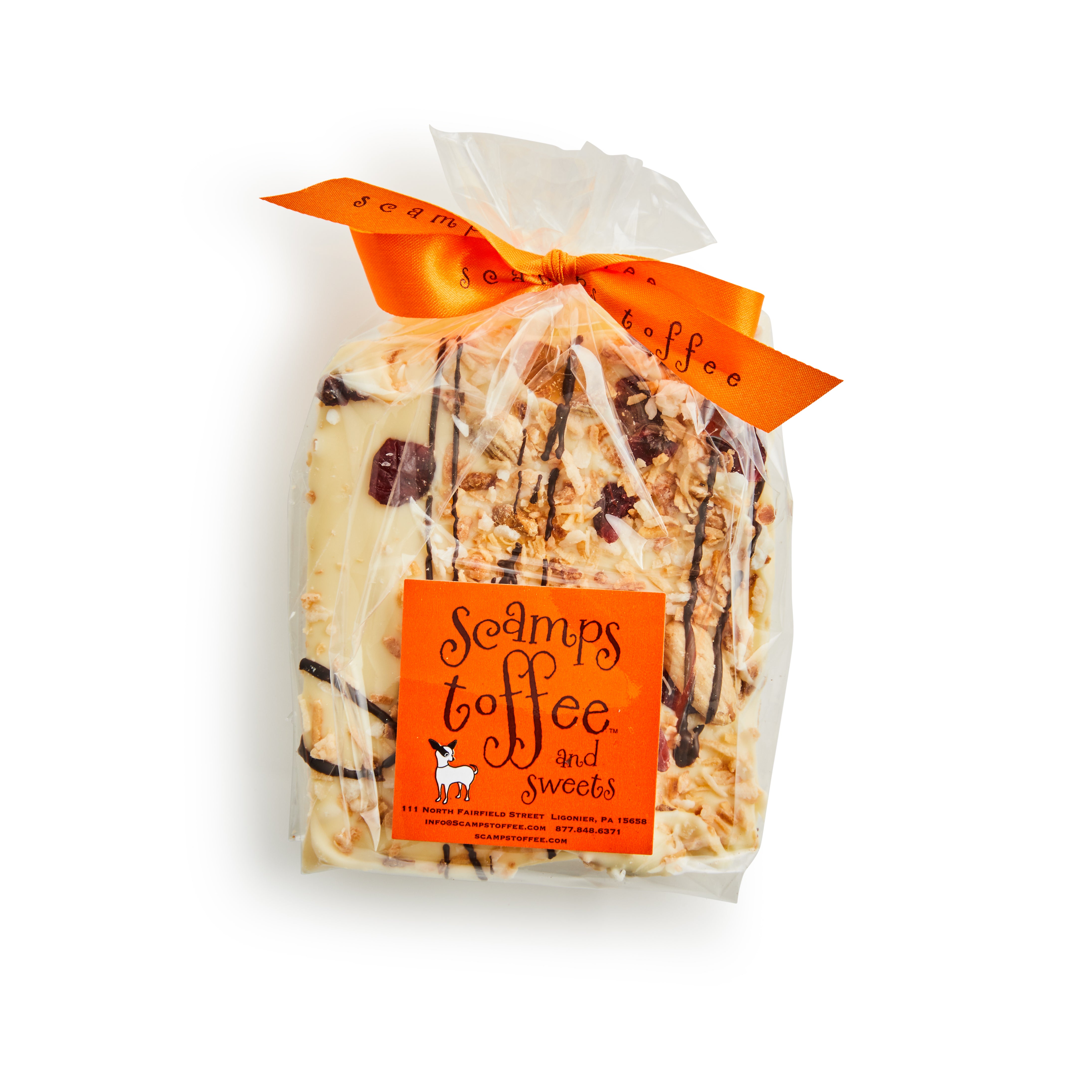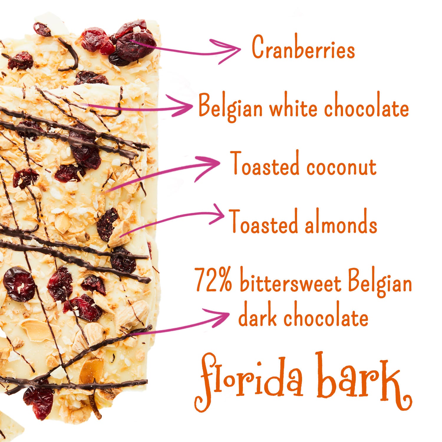 Warm your senses with our creamy white Belgian chocolate, toasted coconut, chopped roasted almonds, tart cranberries with a dark Belgian chocolate drizzle. Don't forget your beach umbrella! All natural, gluten-friendly and preservative free.